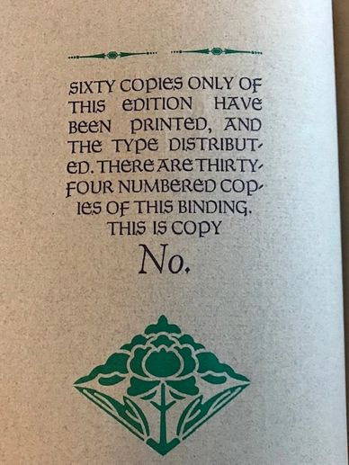 Printed on Moonstone Opal French Laid Paper using violet and green inks from hand-set Goudy type and the type then distributed, assuring one press run printing only.
