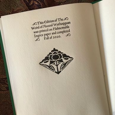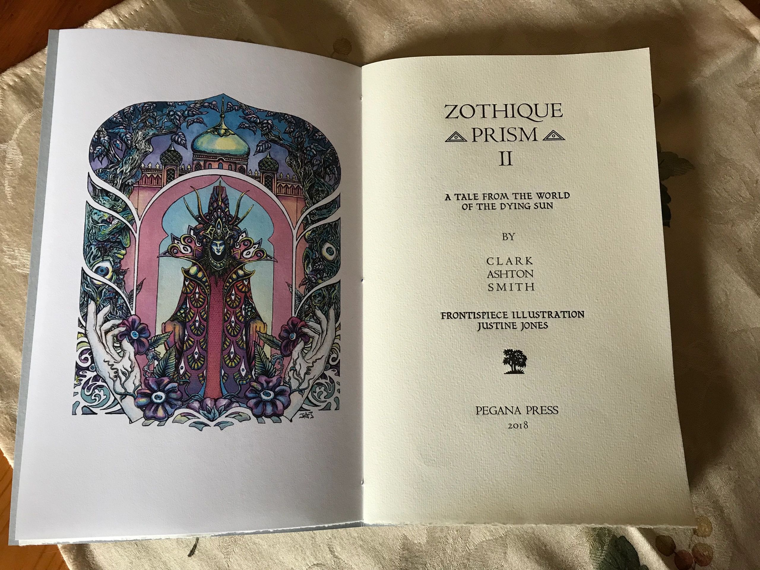 Letterpress printed on German Ingres watermarked paper using vintage Goudy and Civilite types and hand sewn onto pale blue-gray French heavy covers with ornate titling. Letterpress cover uniform with Zothique Prism II.