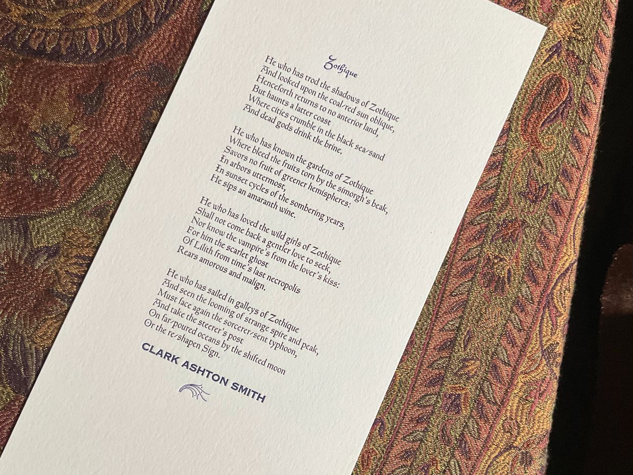 Zothique by Clark Ashton Smith. A poem from the World of the Dying Sun Originally published in Dark Chateau, Arkham House. Letterpress Broadside suitable for framing.