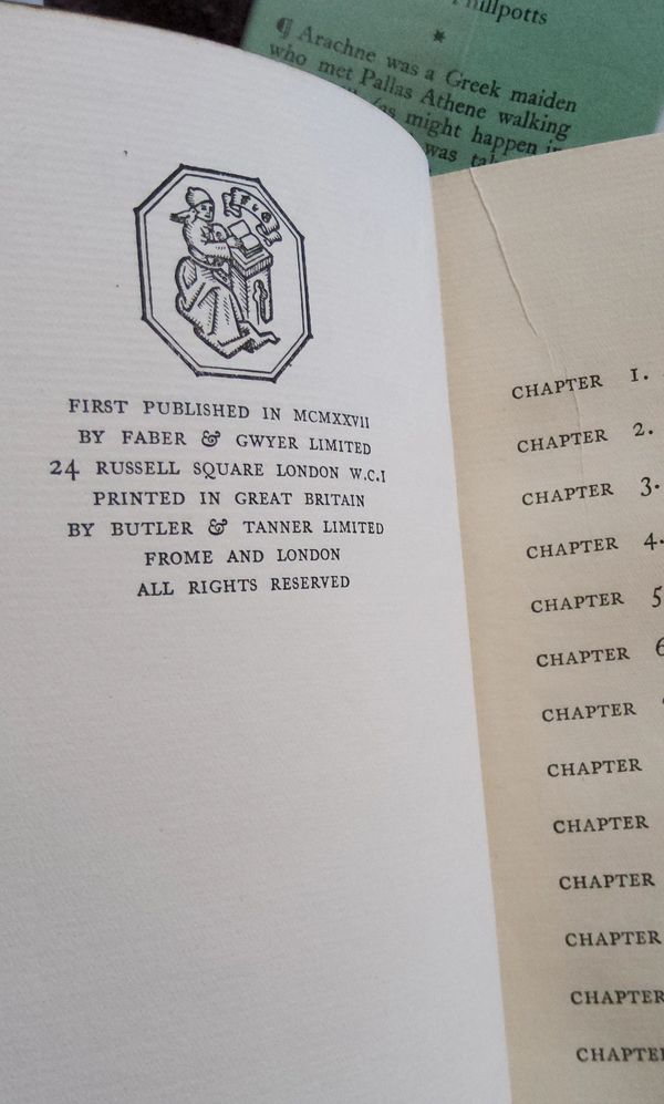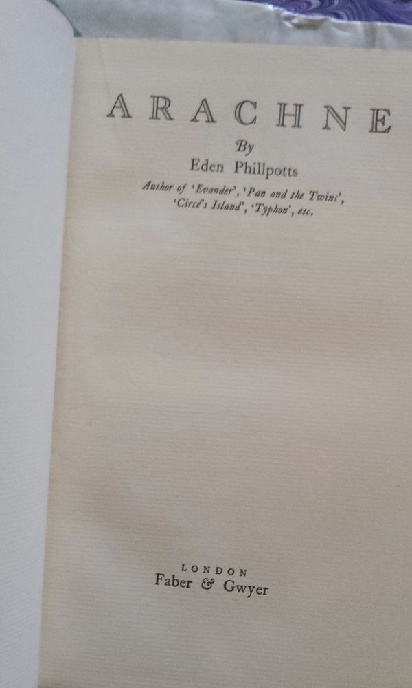 A lovely copy of this Fantastical re-telling of the myth of Arachne wherein she rebels at the teaching of Athene in weaving enchanting webs of silk. A delightful study from Phillpotts about the role of Gods and humans and how they interacted in mythological times. A fine copy in a near fine dustjacket, 1st British edition from Faber and Gwyer Publishers, London.