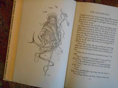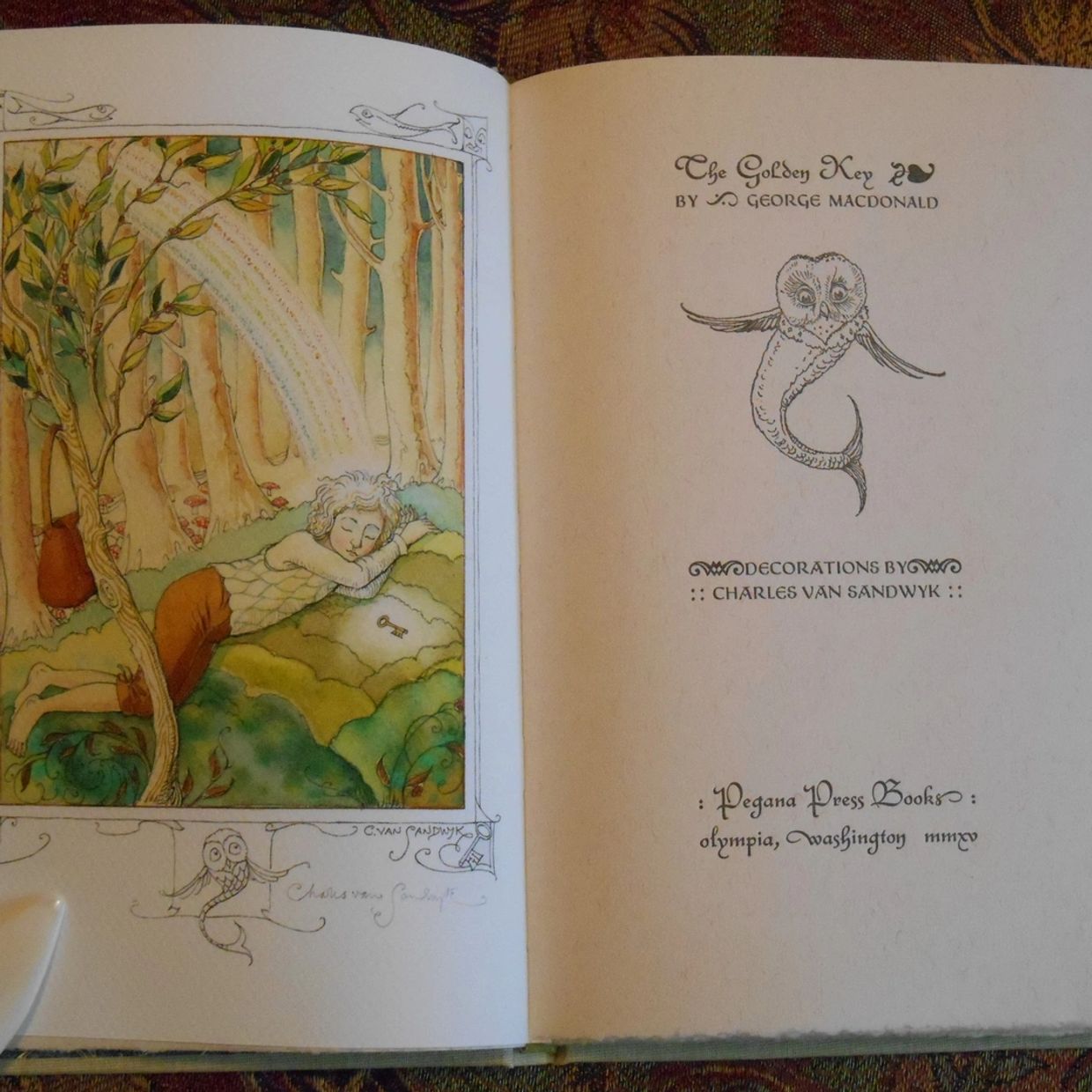 When envisioning the book in my head I felt we needed a beautiful watercolour to begin the book with. I immediately thought of Charles van Sandwyk as the only living artist who could work in that medium as well as the old masters. His eyes and artistic soul had early on been deeply imbued with Arthur Rackham and Edmund Dulac, realms of fairy and imagination. He works on a remote island in the Fiji chain and is surrounded and influenced by the elements and the natural life pulsing around him. His own unique style, while paying homage to the masters, are the vibrant colors he sees about him, and his gentle sense of whimsy and comfort. When I was able to reach Charles, he was familiar with The Golden Key but hadn't read it in years so he read a copy and was moved enough by it to not only agree to do a watercolour but also some pen and ink drawings to thematically tie the book together. Charles is a true renaissance man in that he makes and designs his own books by hand, does hand copper etching plates and uses old world techniques for his work. It was truly a collaboration as he understood and was familiar with the papers and shades I was using and how his artwork would best translate to the mediums of the book. He personally supervised the Giclee printing of the watercolour and volunteered to hand sign each one. He really cares about making beautiful books and having the artwork be as fine as possible. His wonderful pen and ink drawings of the aeranth, The Old Man of the Sea, and a stylized Golden Key to end the book were made into laser etched magnesium plates and locked into the press and printed letterpress. It was a rare privilege to have someone as gifted as Charles contribute to the life of the book.